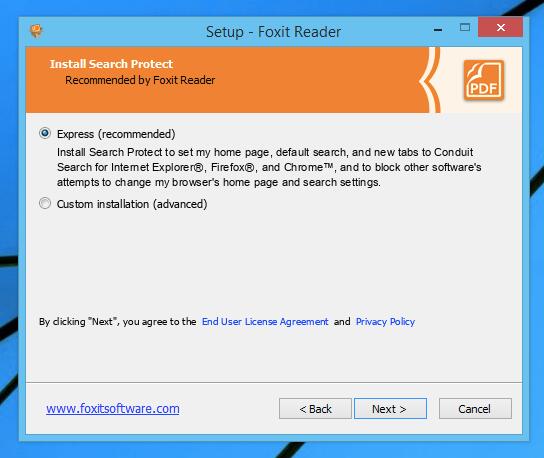 One example is the popular FoxIT PDF Reader – which has default option to install the horribly intrusive “Search Protect” and “Conduit Search”.