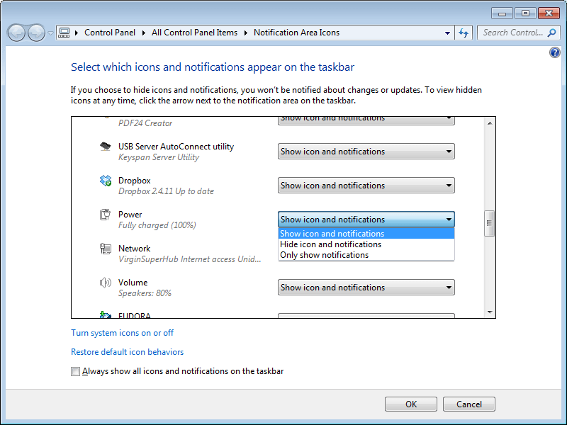 You can also change the behaviour of other icons, there are some that you might want to always see, so change their setting to Show Icon and Notifications.